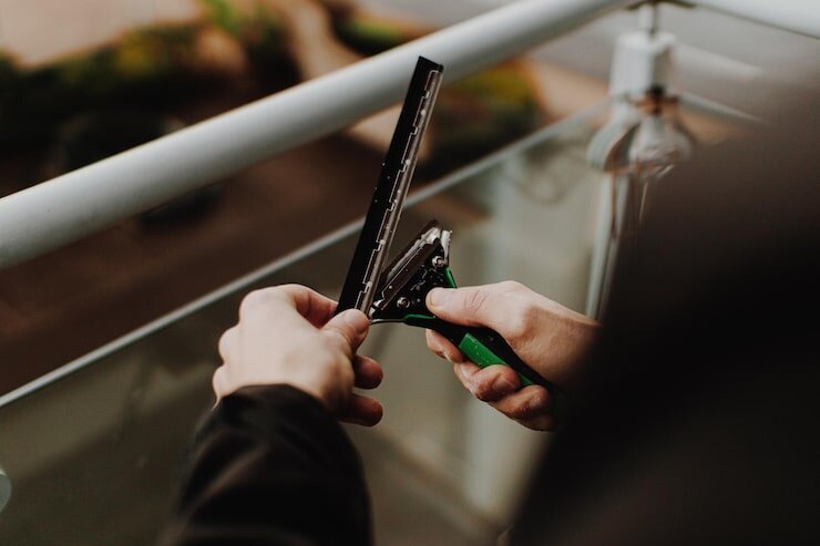 Mix two tablespoons of liquid dish soap into a quart of warm water. Apply this solution with a soft sponge, working from top to bottom in small sections. For upper-level installations or hard-to-reach areas, attach your squeegee to an extension pole. This saves you from dangerous ladder work while still getting spotless results.
